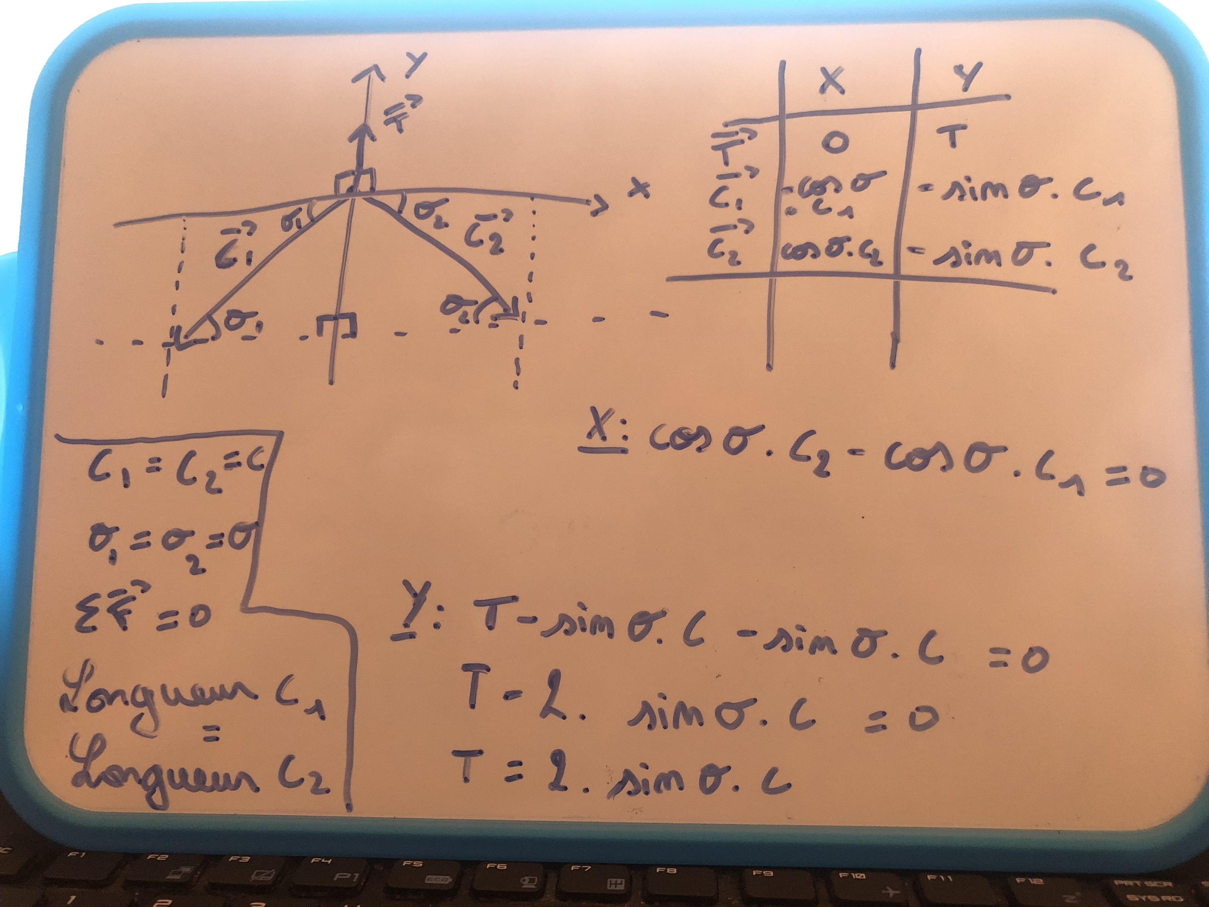 E-Bahut julesx Posté(e) le 14 août 2023 E-Bahut Signaler Posté(e) le 14 août 2023 Bonjour, Comme je n'ai pas enseigné la mécanique, je ne connais pas forcément les démarches exactes. Cela dit, ton point de départ me parait correct.. Par contre, on n'a pas T=2*sinΘ*Ff car Ff et les C ne sont colinéaires. En fait, seules les projections horizontales des C sont compensées par les Ff, donc on a C*cosΘ=Ff. De T=2*sinΘ*C et C*cosΘ=Ff, on déduit T=2*tanΘ*Ff qui, pour moi, est la réponse à la première question. Pour la suite, je pense qu'il faut exprimer Θ en fonction des données h et L. C'est facile ici, on a sinΘ=h/(L/2). On en déduit une expression de h en fonction, en particulier de T à utiliser pour répondre aux deux questions suivantes. Je te laisse regarder cela N.B.: J'ai fait comme toi, j'ai raisonné sur les normes des vecteurs. Citer