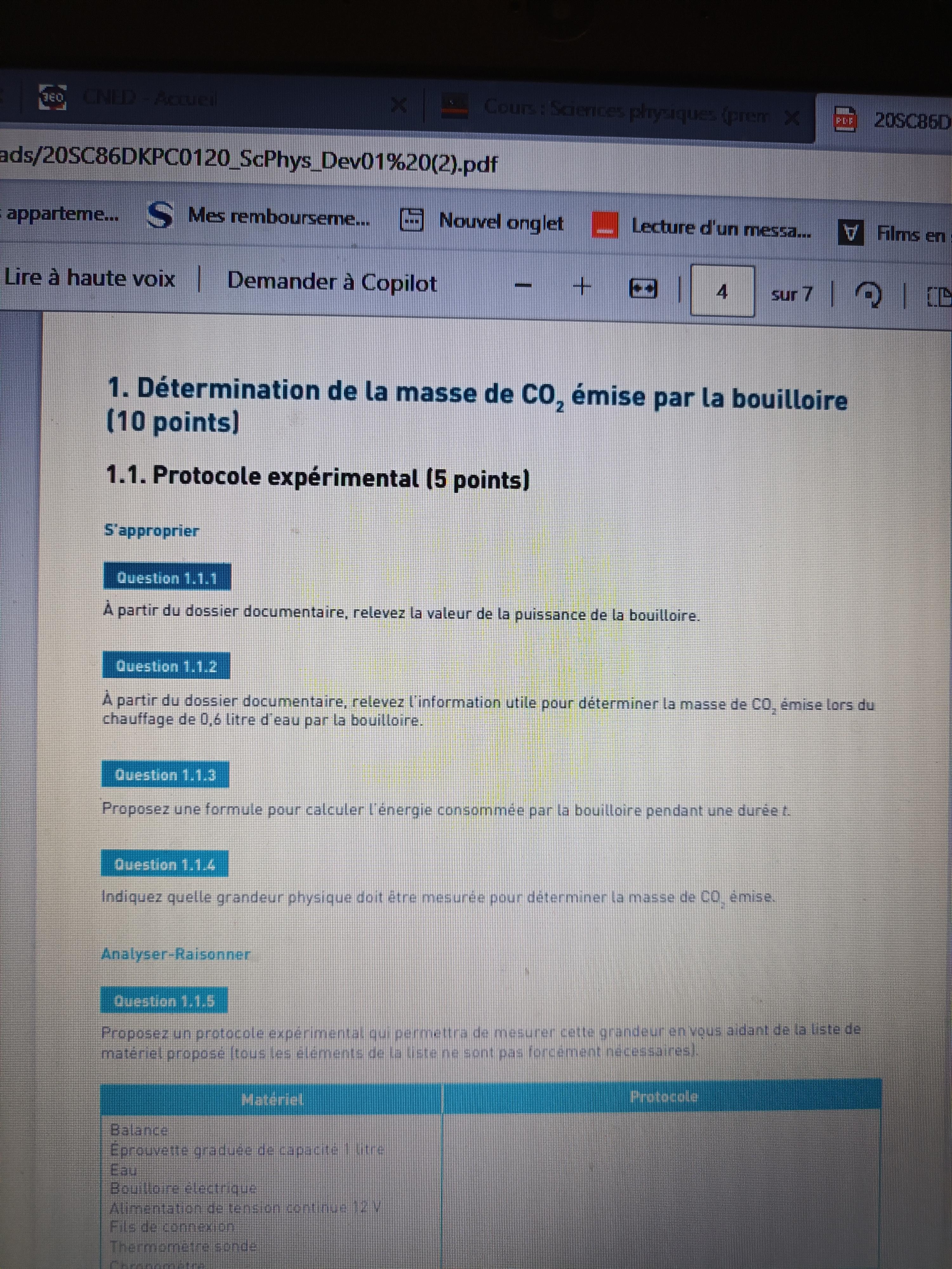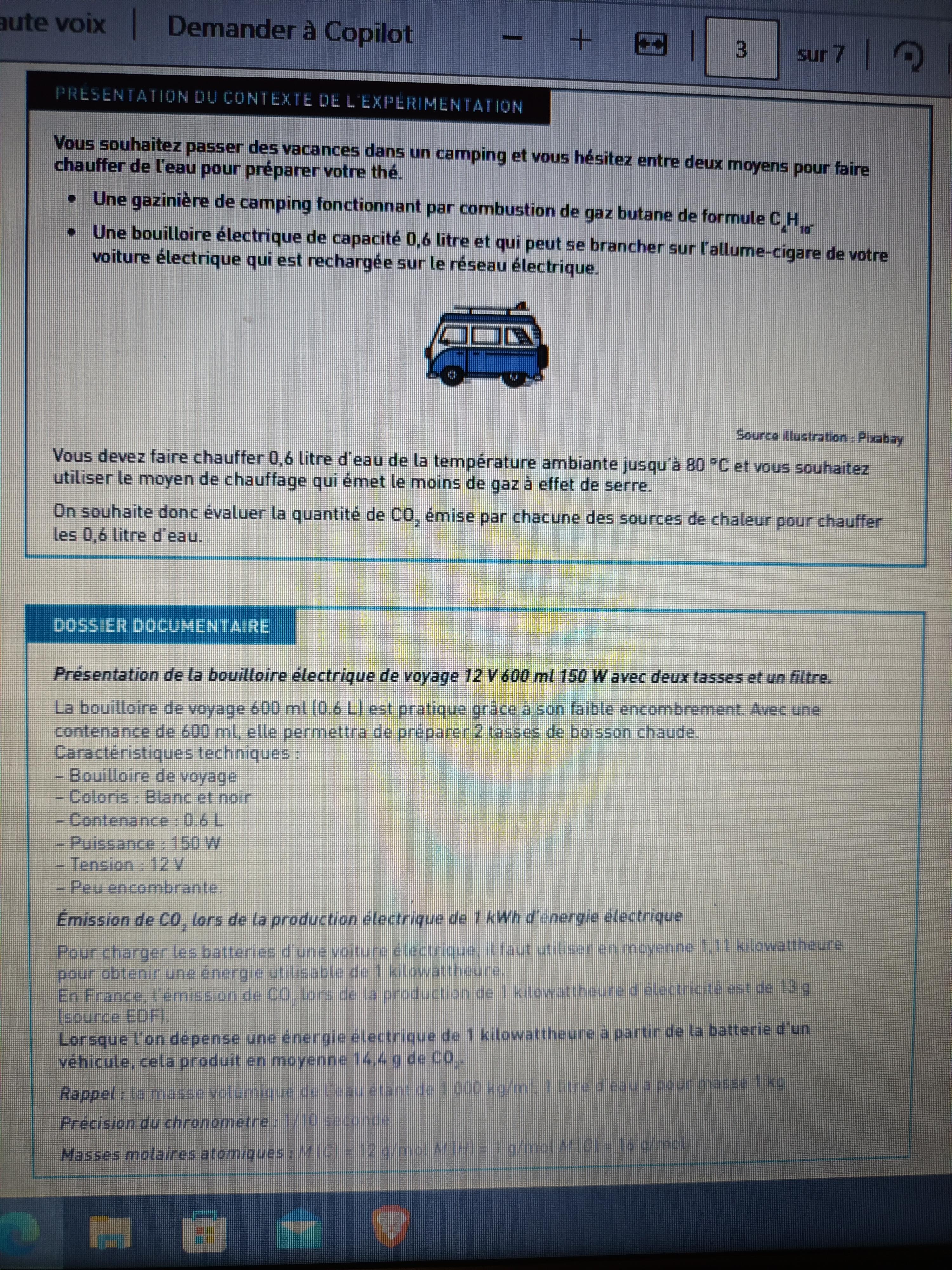 Black Jack Posté(e) le 15 janvier 2024 Signaler Posté(e) le 15 janvier 2024 Bonjour, Il faut faire un minimum d'effort pour avancer par toi même. Se contenter de recopier est inutile. Essaie de comprendre tout ce qui suit ... et tu dois être ensuite capable de tout refaire seul(e) sans aide. Question1.1.1 C'est immédiat ... si on comprend de quoi on parle. C'est écrit en toute lettre dans les données : Bouilloire de voyage : Puissance : 150 W Question 1.1.2 L'information utile nécessaire (mas pas suffisante) est : "Lorsque l'on dépense une énergie .... en moyenne de 14,4 g de CO2" (donnée malheureusement loin de la vérité, actuellement en France la moyenne est d'environ 52 g de CO2/kWh, mais a ne pas prendre en considération dans l'exercice présent) Question 1.1.3 Pour chauffer 0,6 litre d'eau (liquide) de la température ambiante (environ 20°C) à 80°C, il faut élever la température de l'eau de 80-30 = 60°C La chaleur massique de l'eau est de 4180 J/(kg.°c) et la masse volumique de l'eau est 1000 kg/m³ (soit 1kg/L) L'énergie nécessaire est donc E = m * C * (Delta theta) Avec m la masse d'eau en kg, C la chaleur massique de l'eau en J/kg (4180 J/kg) , Delta theta est la variation de température (en °C ou en K) Et m = V * Rho Avec V en m³ le volume de l'eau, Rho la masse volumique de l'eau en kg/m³ (1000 kg/m³) Donc E = V * Rho * C * (Delta theta) E = 0,6.10^-3 * 1000 * 4180 * 60 = 150480 J Ceci sans compter les pertes de chaleur dans l'air ambiant et la quantité de chaleur nécessaire à élever la température du récipient (ici la bouilloire) ... ce qui fait que la valeur de E calculée est beaucoup trop petite par rapport à ce qui arrivera vraiment. Question 1.1.4 Il faut mesurer la consommation en énergie électrique pendant la mise en température. Pour le faire, si on se fie à la puissance (150 W) indiquée pour la bouilloire, on pourra mesurer le temps (au chronomètre) que met l'eau pour passer de la température ambiante (qu'on mesurera avec thermomètre et notera la valeur) jusque 80°C (qui sera aussi mesuré avec un thermomètre) On calculera l'énergie E = P * t (avec E en Joules, P en Watt et t en secondes) Il faudra ensuite se servir des informations de la question 1.1.2 pour déterminer la masse de CO2 émise. Citer