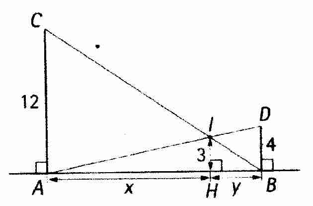E-Bahut pso Posté(e) le 2 mai 2004 E-Bahut Signaler Posté(e) le 2 mai 2004 La seule condition à respecter pour x et y est x = 3y (obtenue avec le théorème de Thalès par exemple). (on peut faire des dessins avec différentes valeurs pour x et on constate que plusieurs solutions sont possibles) Traçons dans un premier temps un triangle ABC rectangle en A tel que AC = 12 et AB quelconque, puis le point I sur [bC] et le point H sur [AB] tel que IH = 3 et (IH) // (AB). Puis le point D tel que (BD) perpendiculaire à (AB) et D appartient à (AI ). On a alors forcément BD = 4. Donc pour x + y de longueur quelconque, on respecte les données de l'exercice. Il faut quand même x = 3y.