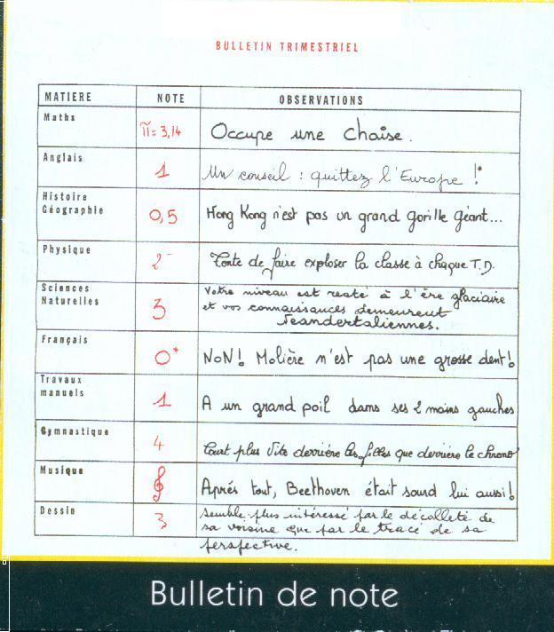 caro50 Posté(e) le 28 septembre 2004 Signaler Posté(e) le 28 septembre 2004 j'trouve ça plutot marrant meme si c'est trafiqué... j'aurai été le prof de sport, je lui aurai mis 2 peut etre, au moins il courait....et c'est deja pas mal!!! :P