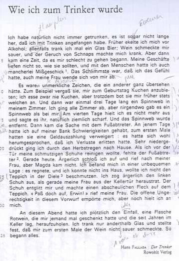 e-bahu Posté(e) le 12 octobre 2004 Signaler Posté(e) le 12 octobre 2004 Bonjour tlm, j'aimerai que vous corrigier mes fautes de langues cepdt les suggestions des idées pour le teste sont aussi bienvenus. Req: je suis tellement nul en allemand que les fautes graves que je fait peuvent choquer. Donc prenez garde :P In diesem Test, Hans Fallada (1893-1947), erklärt deutscher Schriftsteller, dessen "soziale" Romane eine sowohl dunkle als auch treue Tabelle der deutschen Gesellschaft zwichen den zwei Weltkrieg aufstellen, wie man alkoholiker wurden. In der Tat in diesem Beispiel zeigt er mittels des Beispielvielfachen, die banalsten Auswirkungen der Sachen des Lebens hat im Leben eines Mannes. ( die Sache mit dem Fussabtreter). Hans Fallada will also aufrichten, daß die Gesellschaft ein infulence hat, die auf dem Alkoholismus importiert. In der Tat bemerkt man, daß Erwin, Persönlichkeit wichtig dieser Geschichte sich immer mehr von sociéré und sogar von seinem Kreis losbinden familiär. Er schlägt also vor, daß die Isolation und das incomprehention seitens andere der Grund des Alkoholismus ist. voilà ce ke j'ai fait mais comme je comprend moi même très mal à ce que j'écris....Oh!! grand horreur, je vais vous donner en francais ce que j'ai voulu dire Dans ce test, Hans Fallada(1893-1947), écrivain allemand, dont les romans « sociaux » dressent un tableau à la fois sombre et fidèle de la société allemande de l’entre-deux-guerres, explique comment on deveint alcoolique. En effet dans cet exemple il montre par le moyen de multiple exemples, les effets des choses les plus banals de la vie a de répercution sur la vie d'un homme.Hans Fallada veut monter donc que la société a une infulence important sur l'alcoolisme. En effet, on remarque que Erwin, personnage principale de cet histoire se détache de plus en plus de la sociéré et même de sa cercle familiale. Il suggère donc que l'isolation et l'incomprehention de la part des autres est le raison de l'alcoolisme.